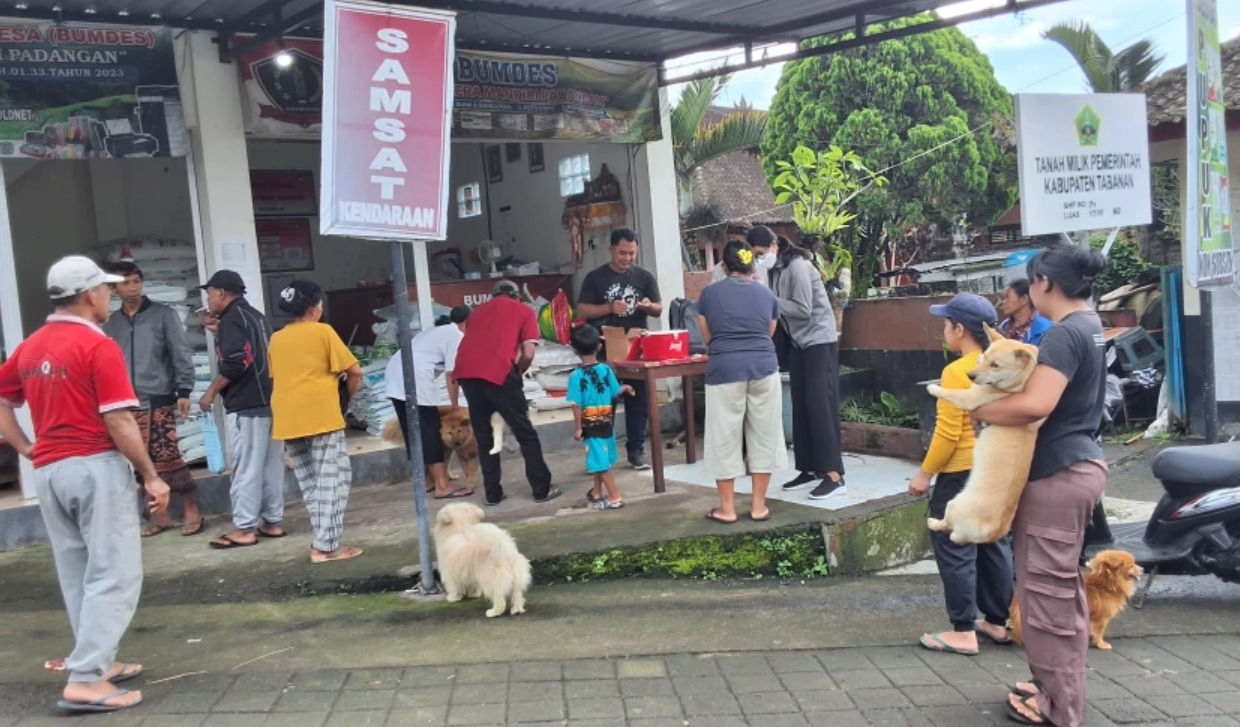 Tabanan – Dalam rangka pencegahan penularan penyakit rabies, Dinas Pertanian Kabupaten Tabanan bekerja sama dengan Pemerintah Desa Padangan melaksanakan vaksinasi rabies untuk hewan peliharaan, khususnya anjing dan kucing pada Selasa (10/6). Kegiatan vaksinasi ini dilaksanakan di dua tempat, yakni depan Kantor Bumdes Padangan dan Bale Banjar Dauh Tukad.