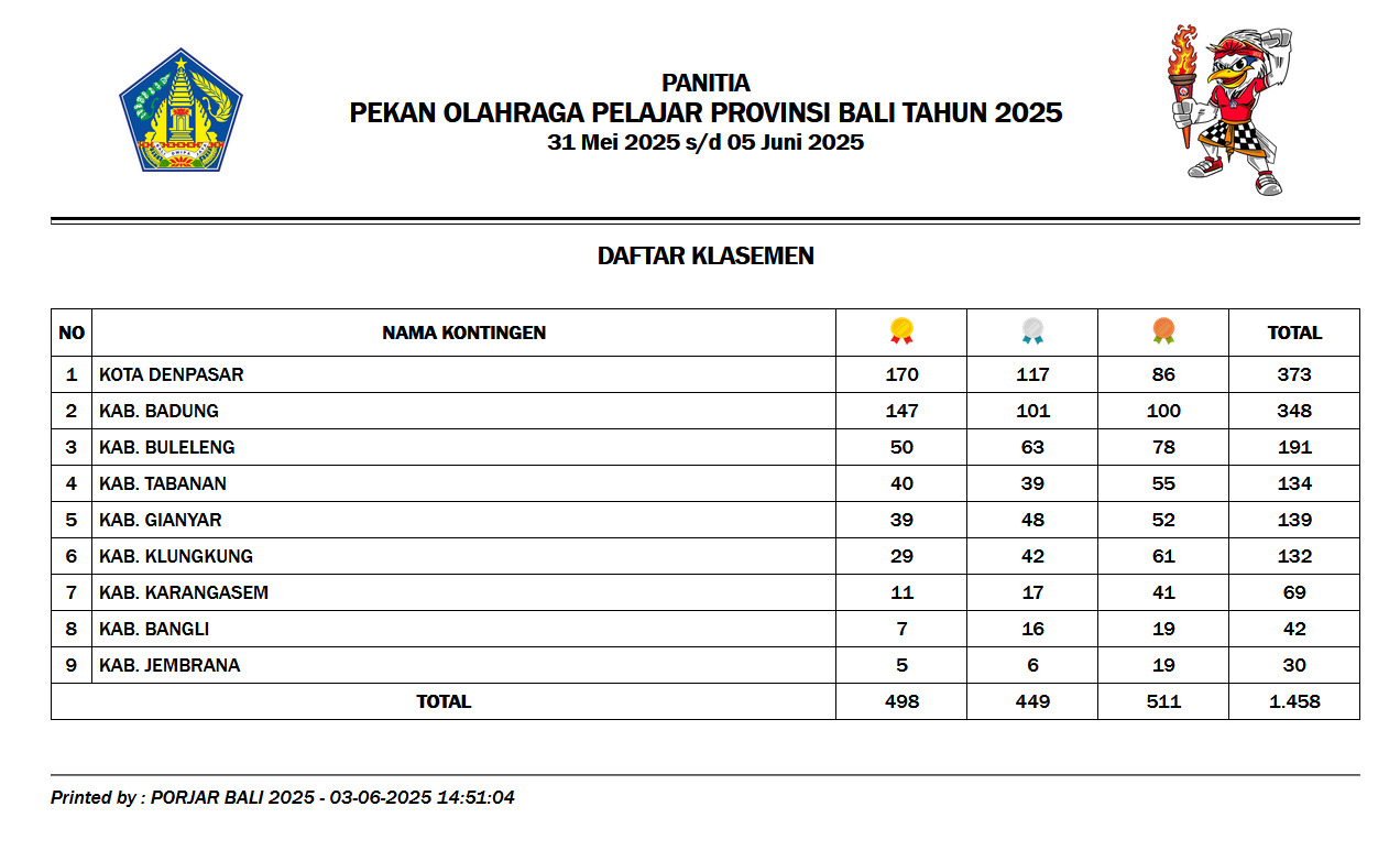 Tabanan – Atlet pelajar Kabupaten Tabanan menunjukkan performa luar biasa dalam ajang Pekan Olahraga Pelajar (Porjar) Provinsi Bali Tahun 2025. Berdasarkan data resmi perolehan medali hingga Selasa, 3 Juni 2025 pukul 14.10 WITA, Tabanan berhasil mengumpulkan total 134 medali, terdiri dari 40 medali emas, 39 medali perak, dan 55 medali perunggu. Perolehan sementara medali ini menjadikan Kabupaten Tabanan ada diposisi keempat.