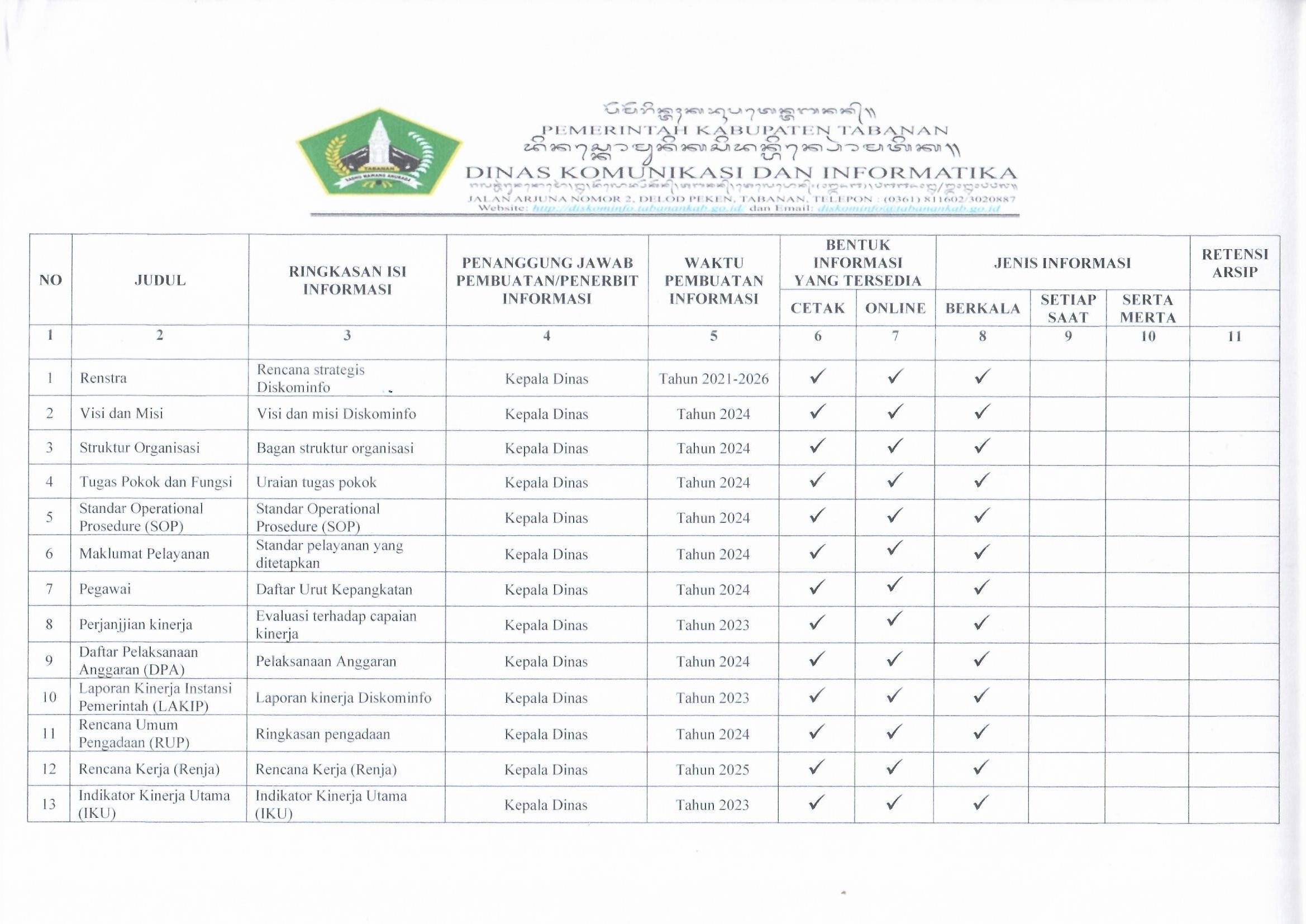 Daftar Informasi Publik Tahun 2024 Penetapan Daftar Informasi yang dikecualikan di Lingkungan Dinas Komunikasi Dan Informatika Kabupaten Tabanan